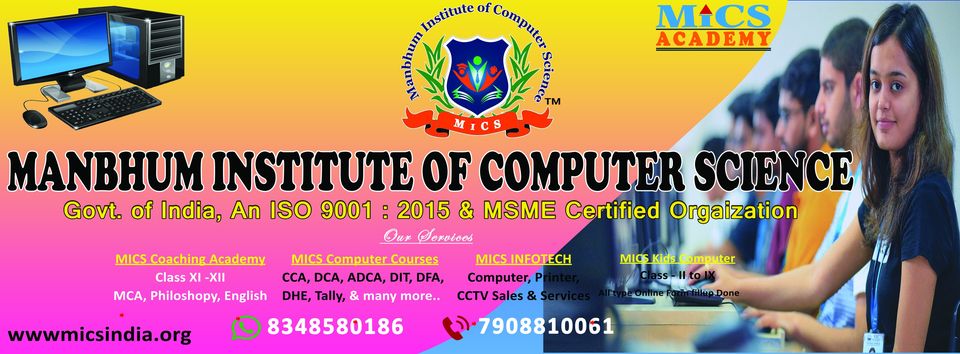 The Manbhum Institute of Computer Science, abbreviated as MICS was set up in 2015 under Societies Act XXVI of 1961, Govt. of West Bengal with a group of young, energetic, dynamic coordinated team with the sprit to establish an Educational Institute along with various technical training at Balarampur, Purulia District to cater to the vast resources of potential students and the Society is also certified by ISO 9001:2015, MSME, Govt. of India. We are a leading Information Technology as well as Coaching Institute. Our Institute has the technology and focused quality for providing cost effective solutions for today’s requirement of standard companies. We are mainly focusing upon the middle class families who cannot afford the high charges. Our society studied their requirement properly and decided to provide better higher education, preparatio ... Read More
